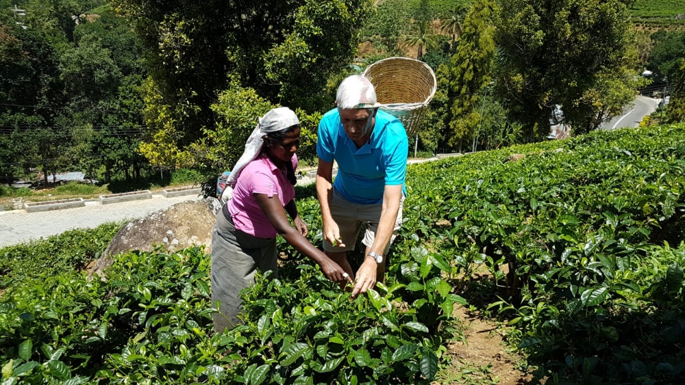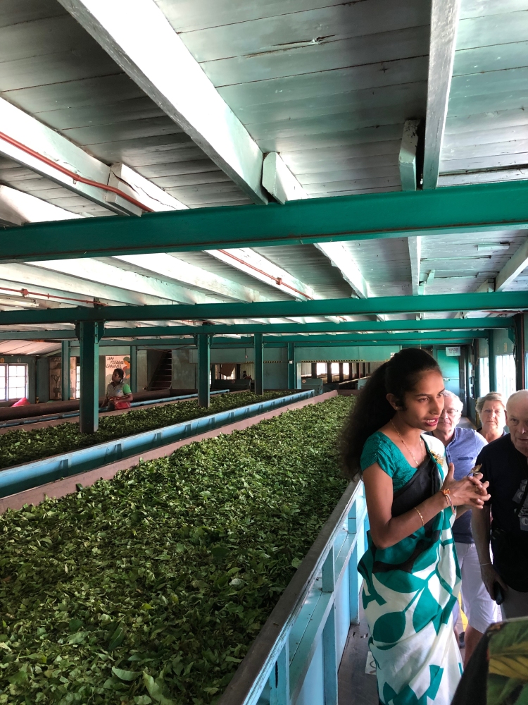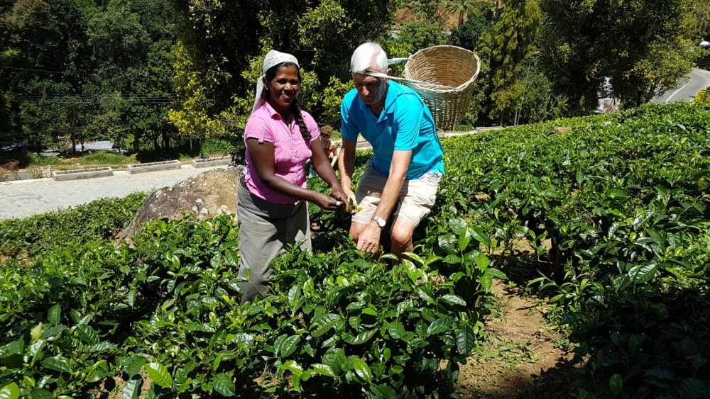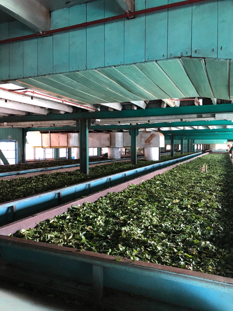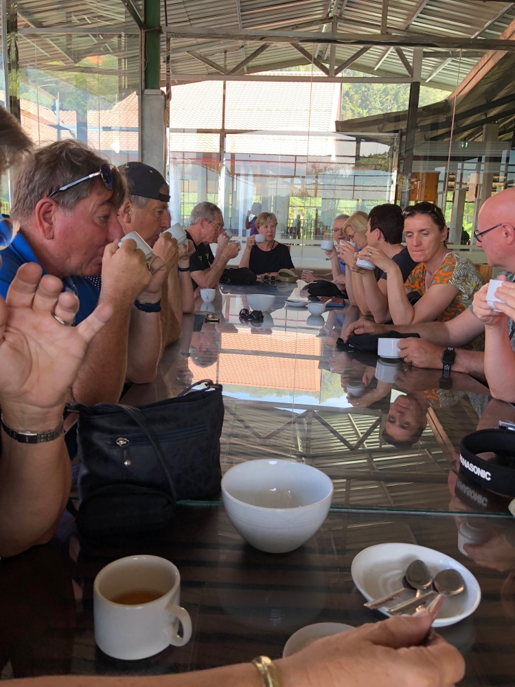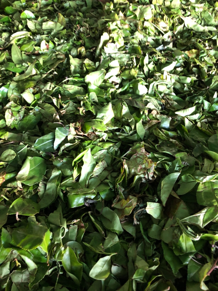 In de ochtend eerst een theeplantage bezocht. De thee wordt in grote bakken droog geblazen: van 2000 kg terug naar 600 kg. Het was leuk om zelf eens te proberen thee te plukken: die mand kon ik niet goed op zijn plek houden.