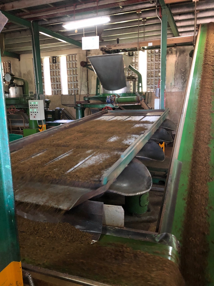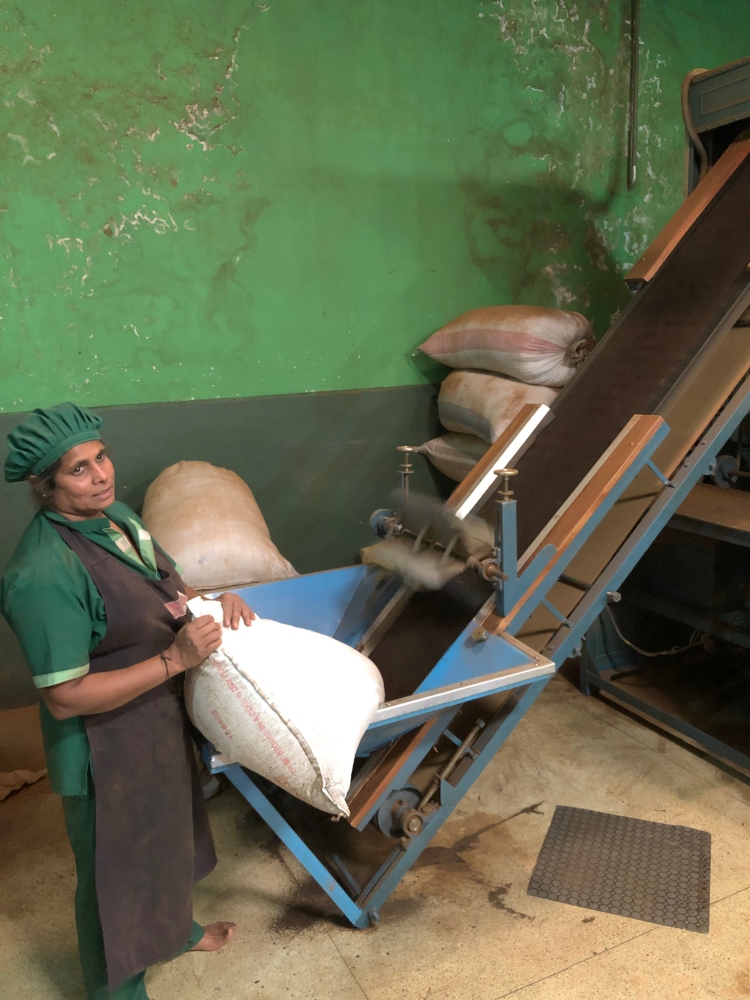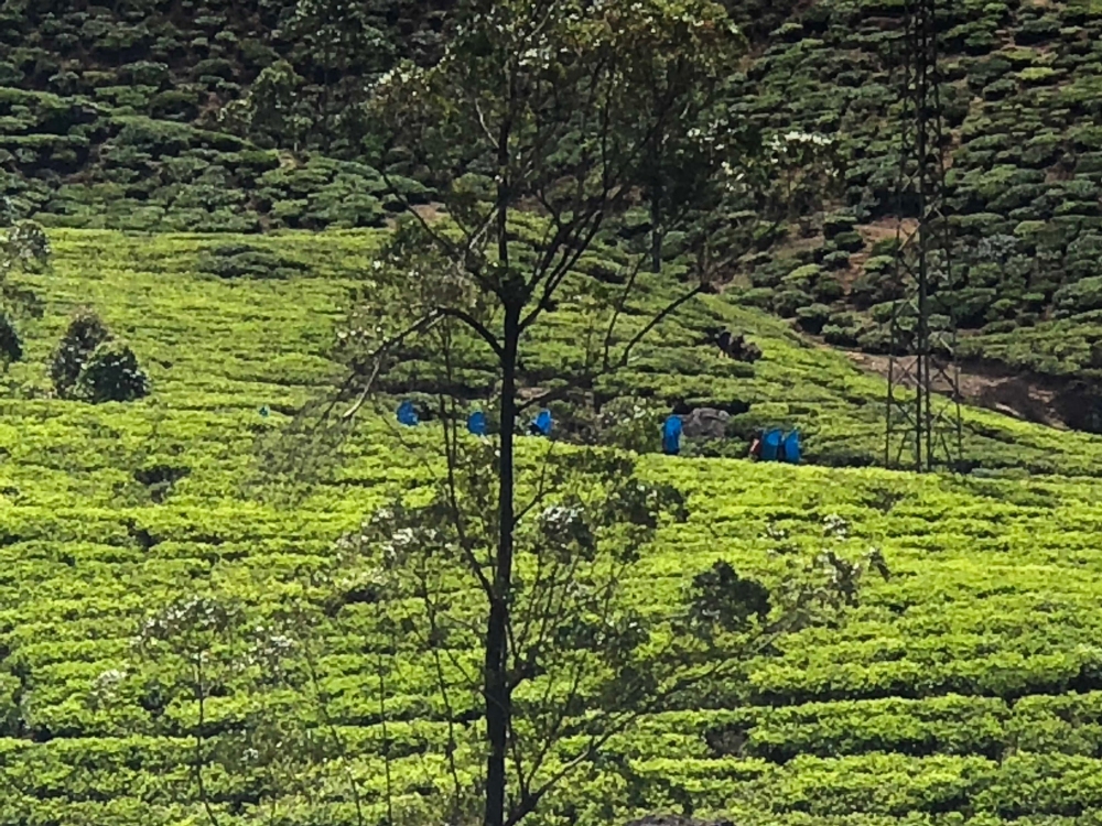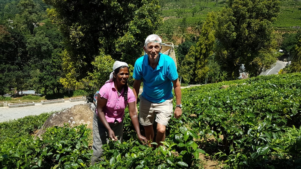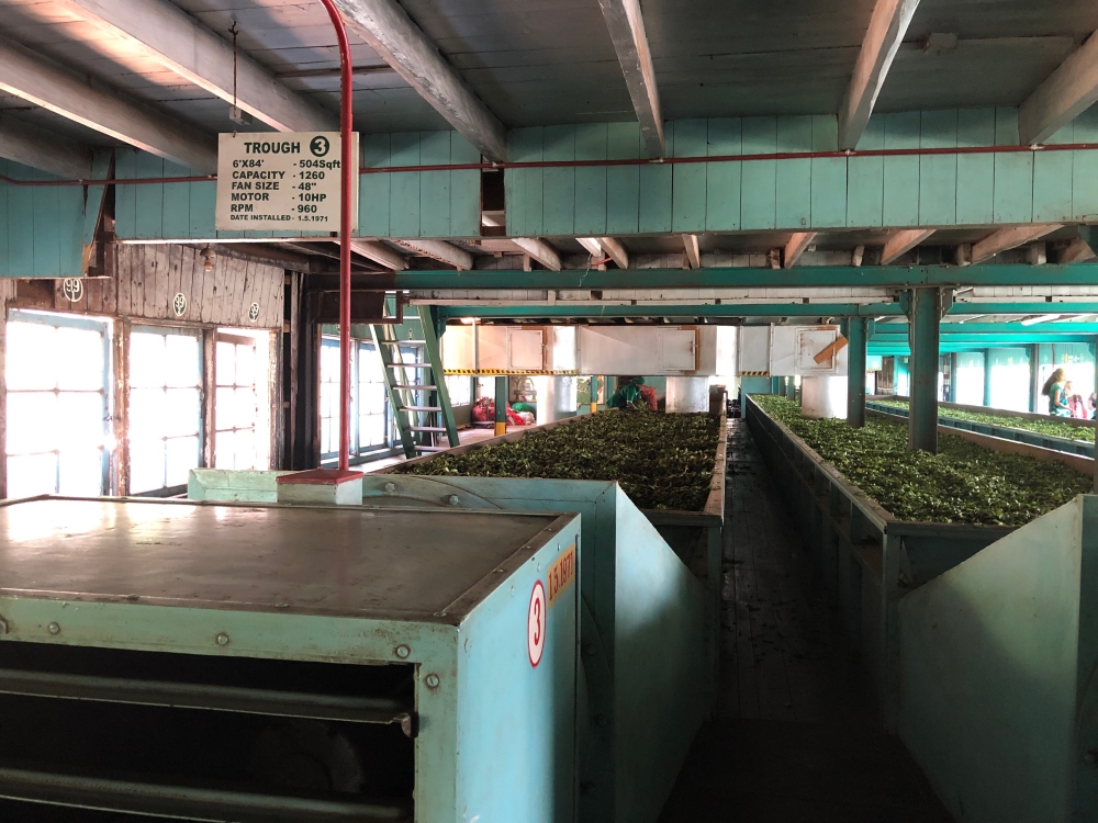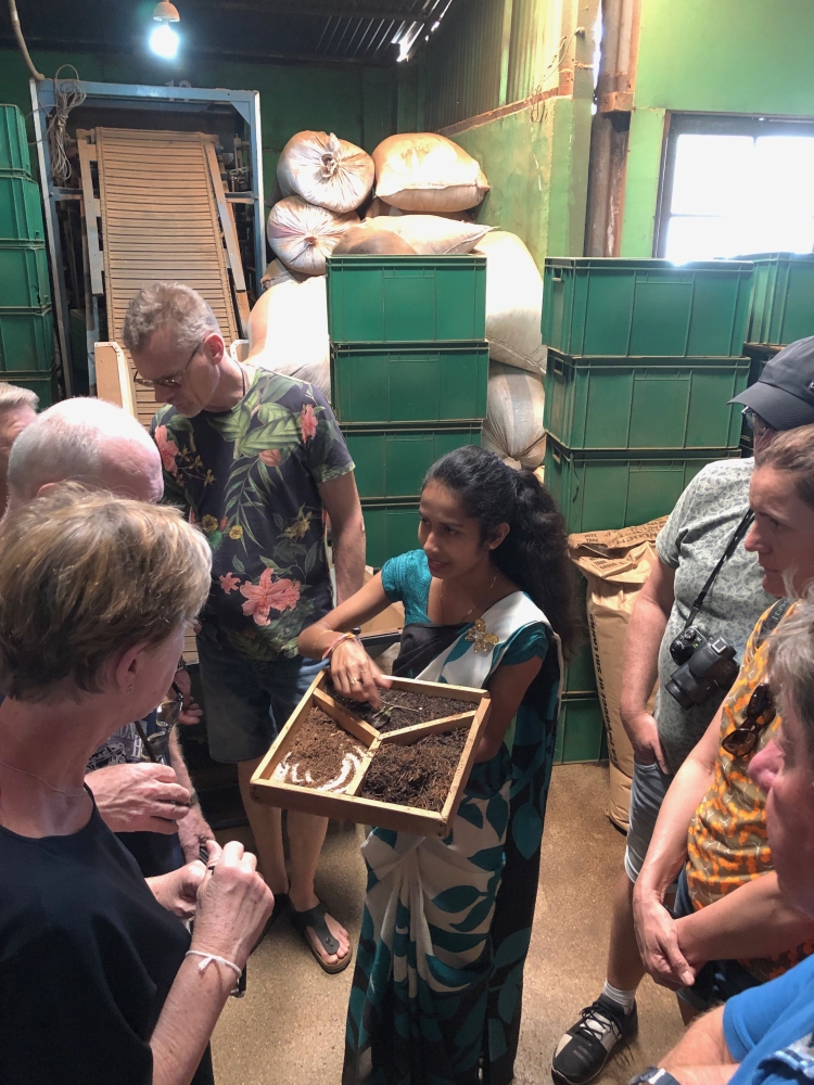 In de ochtend eerst een theeplantage bezocht. De thee wordt in grote bakken droog geblazen: van 2000 kg terug naar 600 kg. Het was leuk om zelf eens te proberen thee te plukken: die mand kon ik niet goed op zijn plek houden.