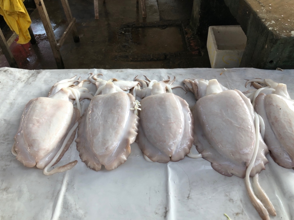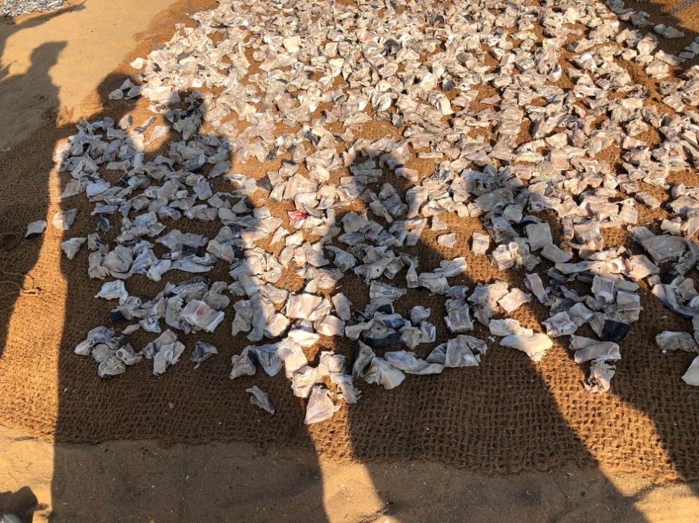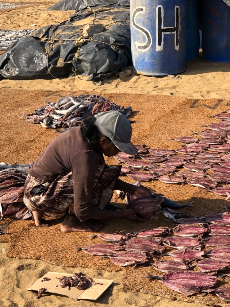 Deze vismarkt bevindt zich aan het strand en de ‘visafslag’ óók. Alles werd ter plekke ontkopt, schoongemaakt en te drogen gelegd.
